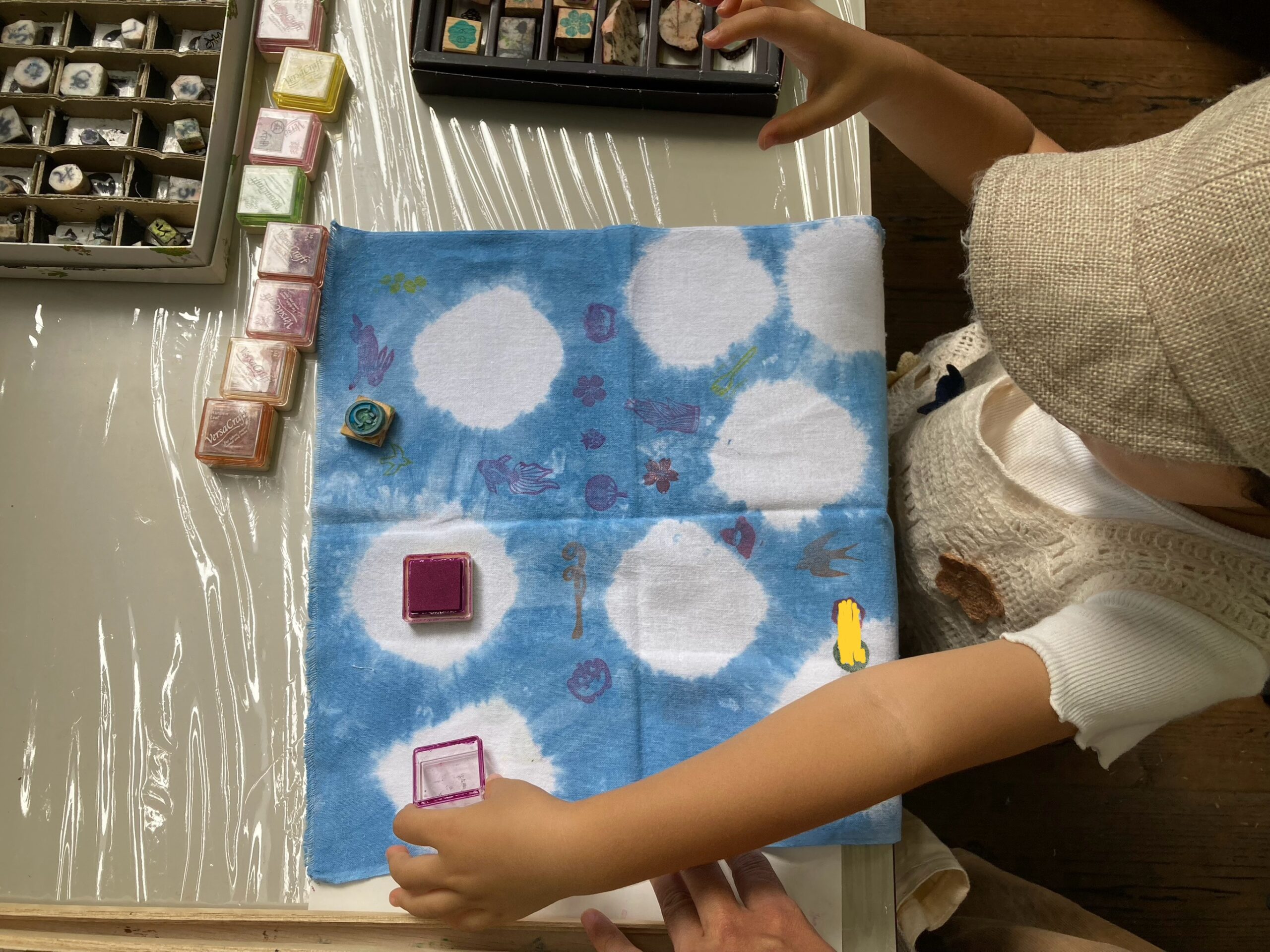 私はTシャツ良いじゃんと思って来たら、娘はハンコが押したい!と言うのでハンコ押しの方にしました。好きなタイダイ染めのハンカチを選んで、そこに自由にハンコを押していきます。文字のハンコもあったので名前を押しました。手作りハンコのようで味があり可愛い✨