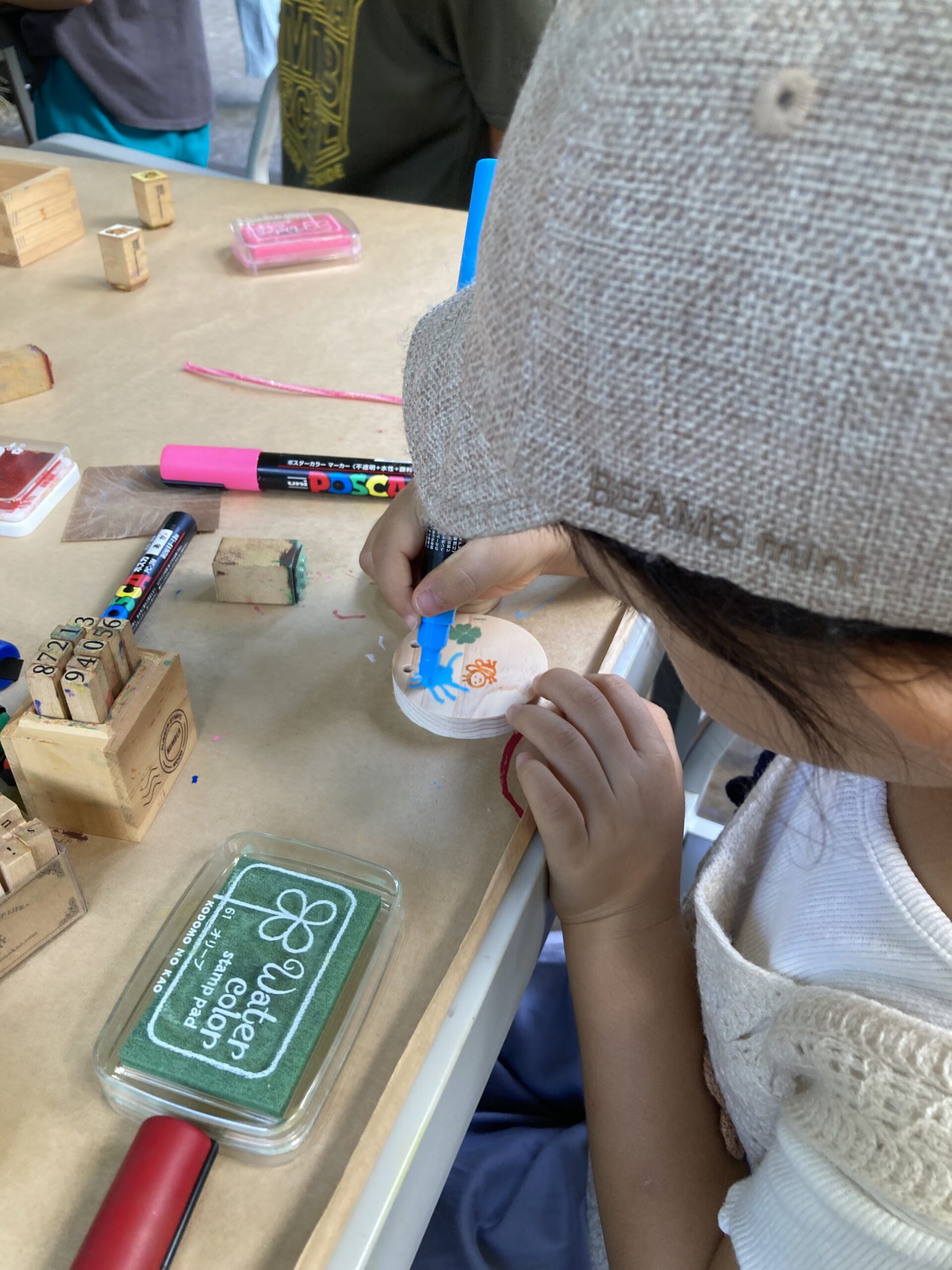 最後はカスタネット作り。材料の木に絵を描いたりハンコを押したりしてデザインします。