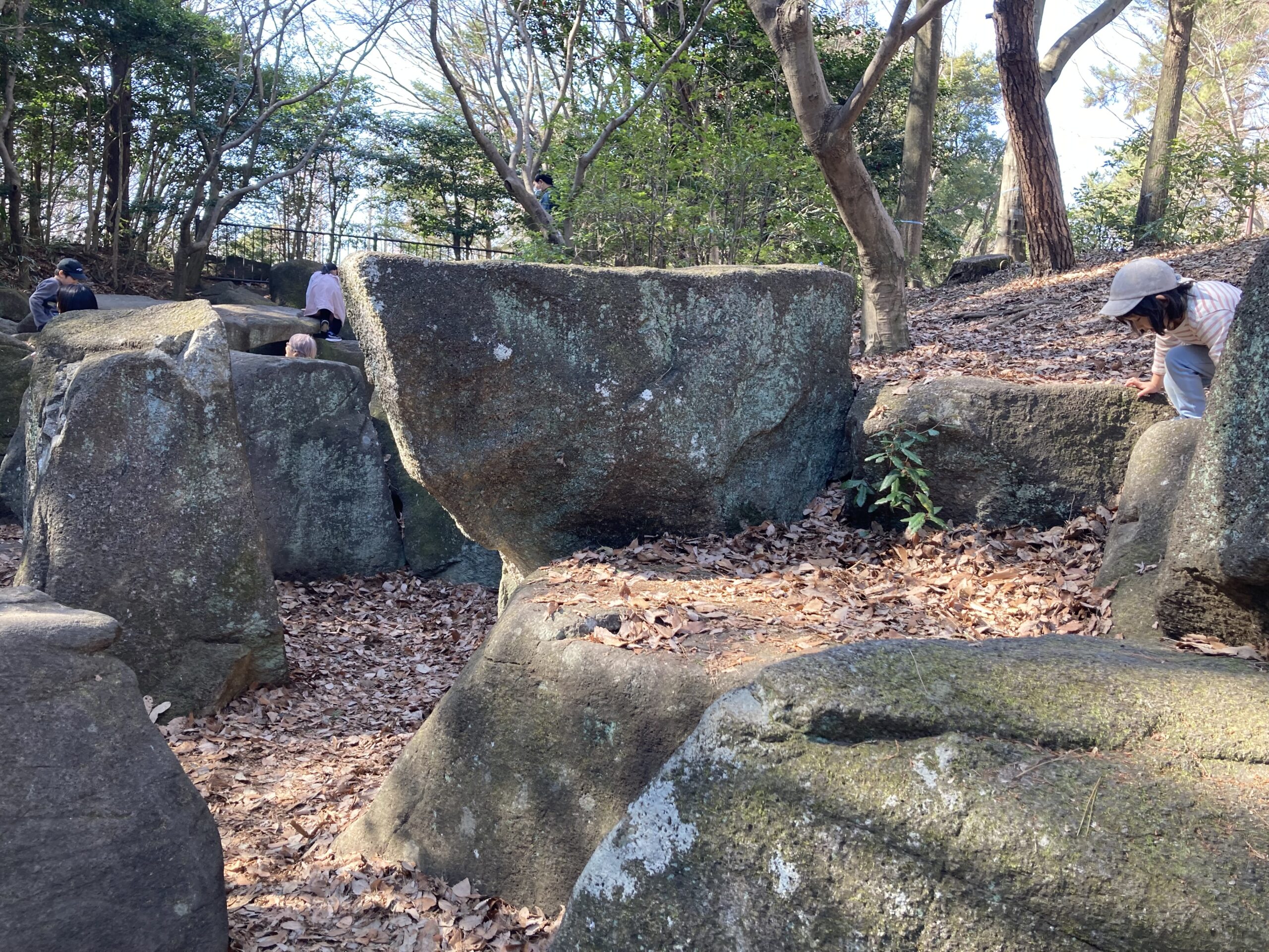 遊具の周辺に大きなドラゴンの顔がある場所があって、その横のトンネルを潜ると「石の谷」という大きな石が置いてある所があるんですね。たまたま見つけたこの場所が大変気に入ったようで、昨日は遊具はそこそこにずっとここで海賊になりきって遊んでしました。