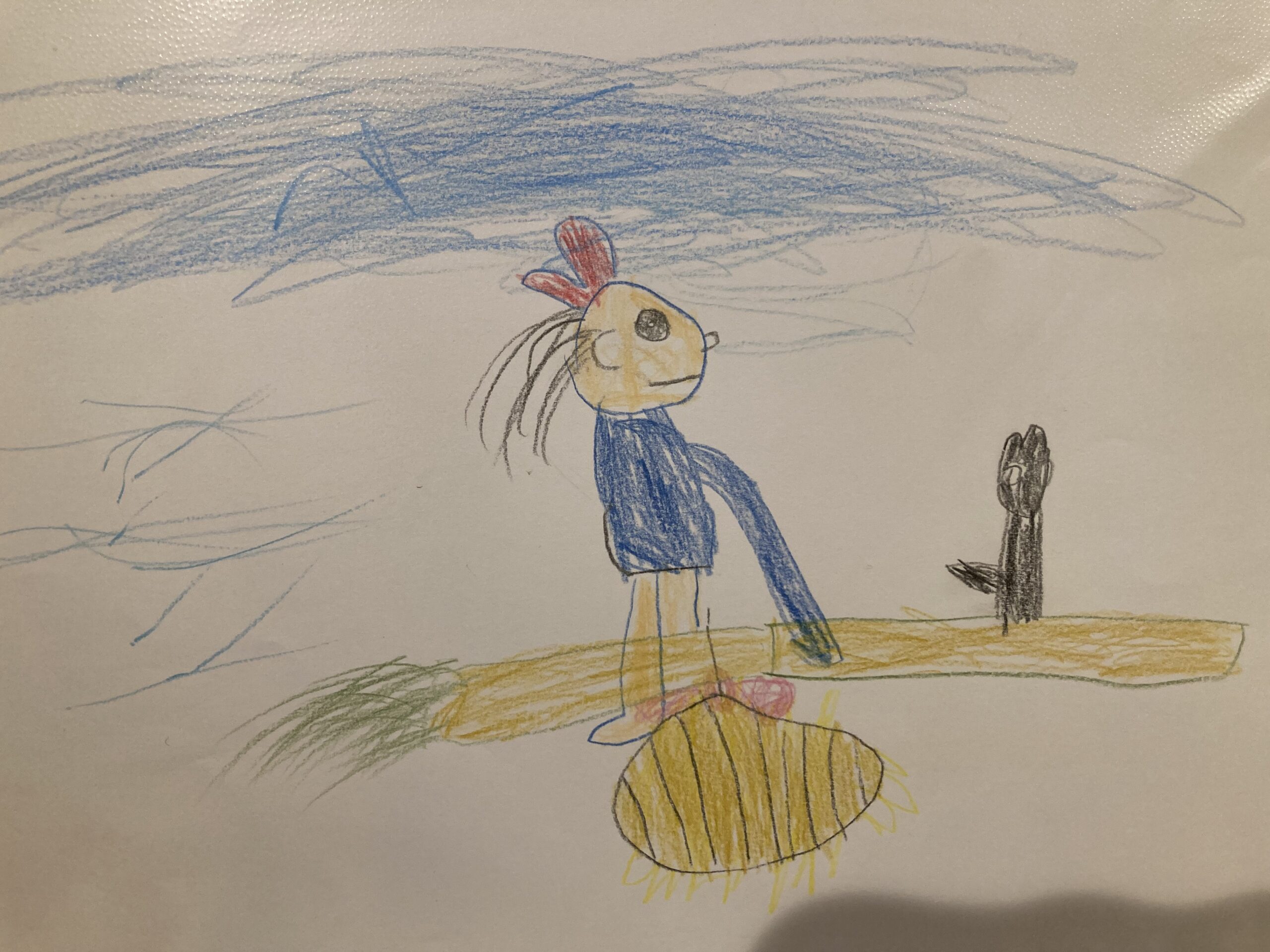 乗っている様子を描きたいけれど、どう描いたら良いのか表現出来ずに不機嫌になる娘。こうしたらどう?と提案して出来たのがこの絵です。