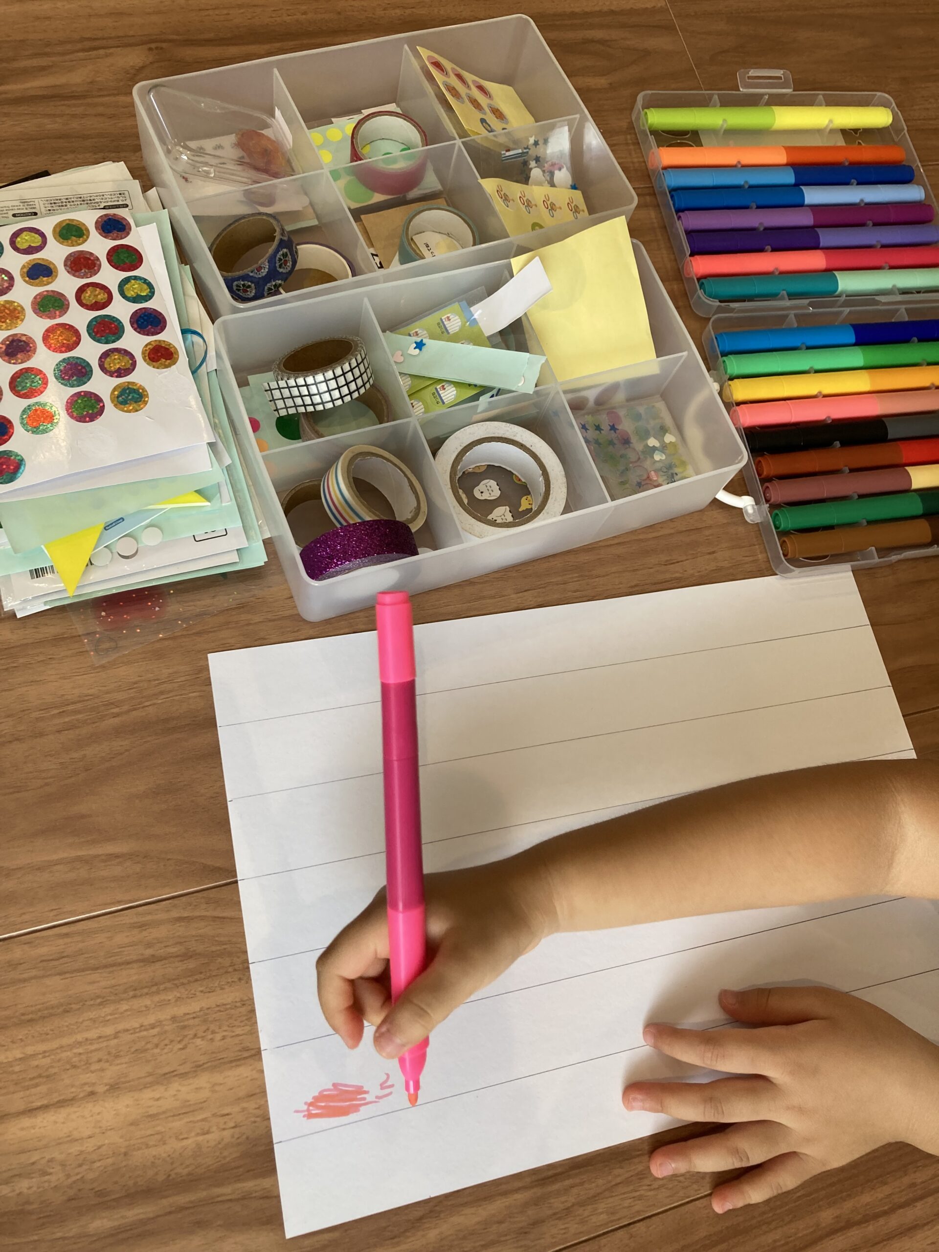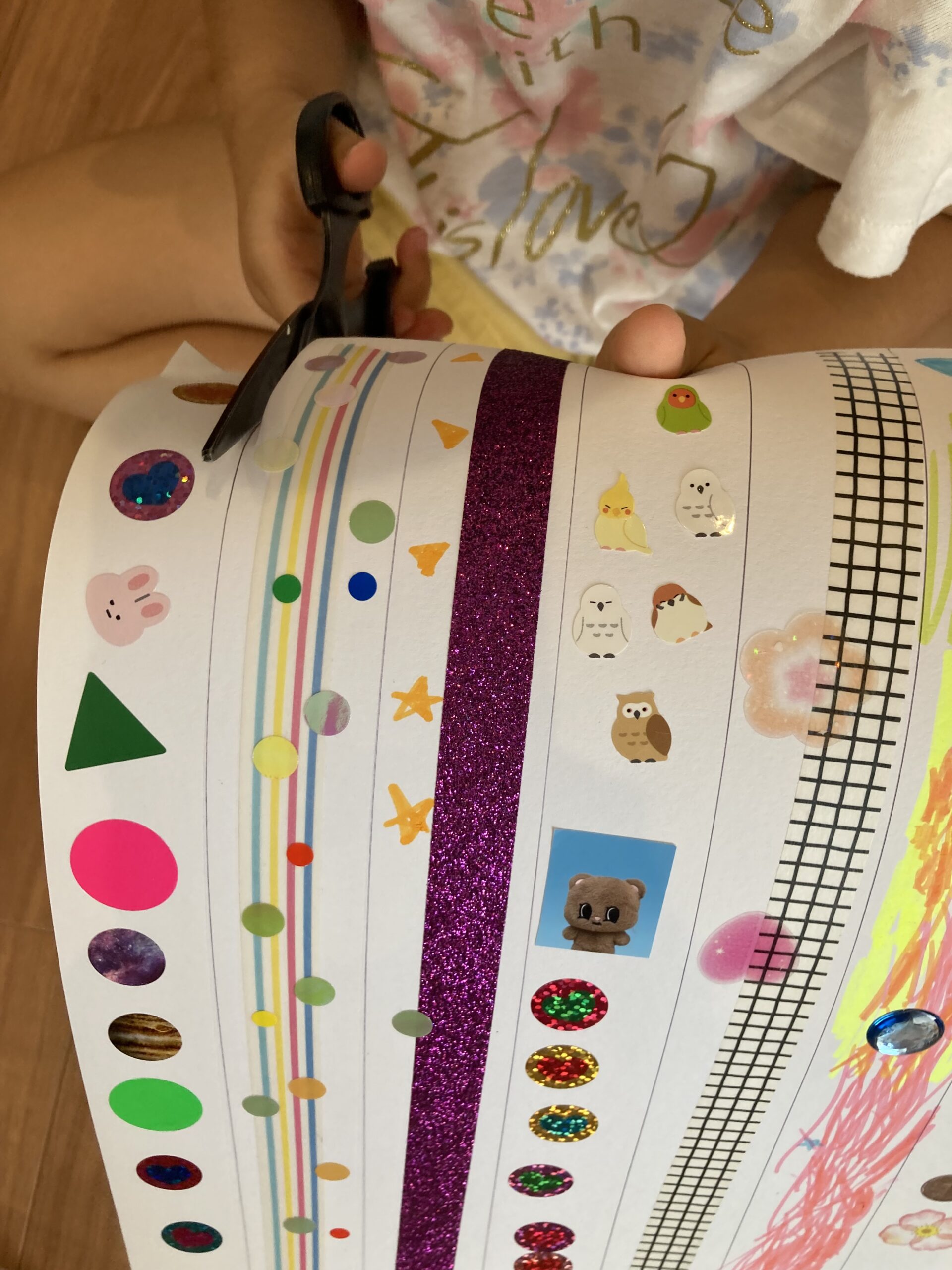 線を引いた画用紙に色を塗ったり、シールを貼ったりします。
