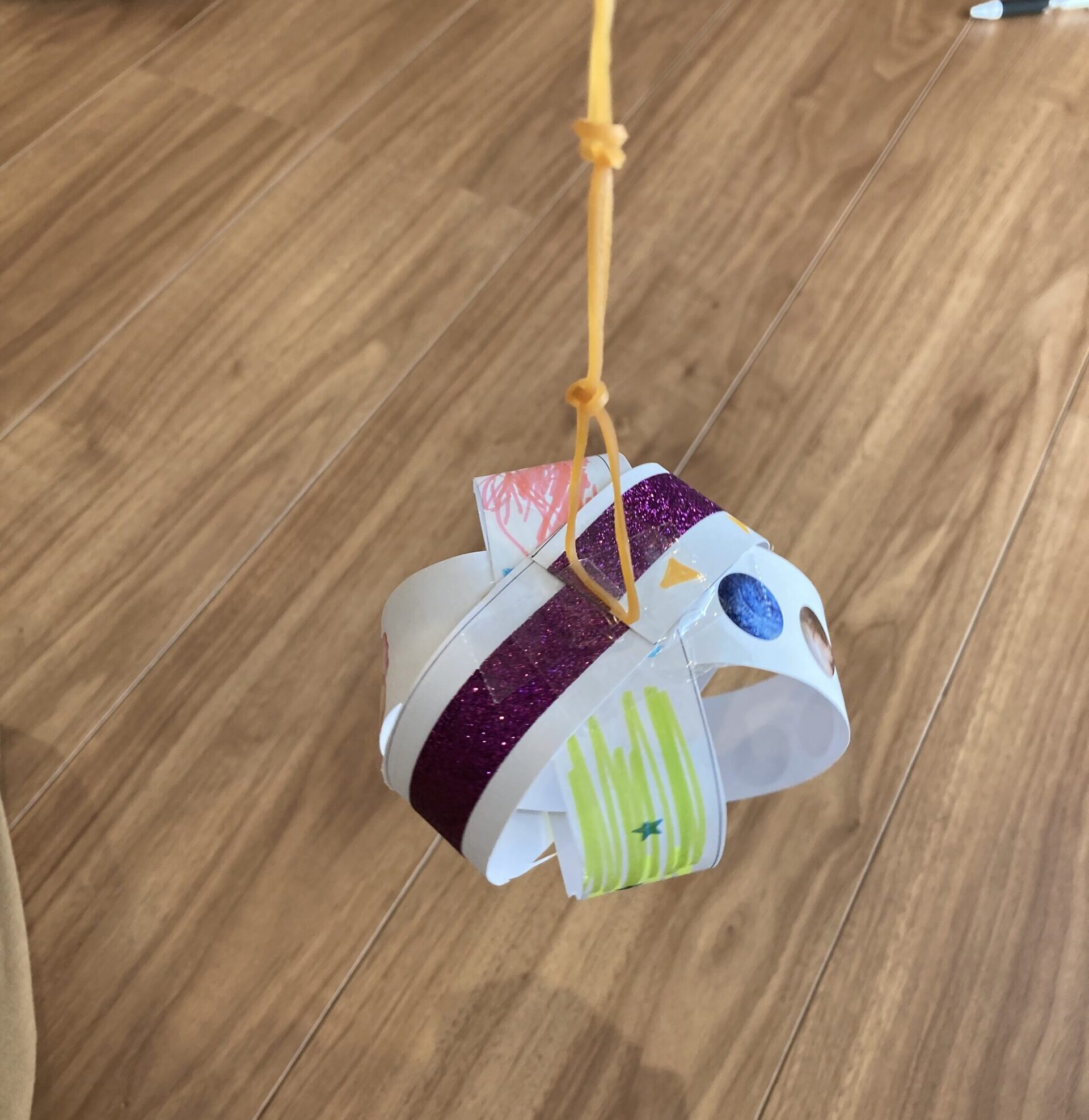切った画用紙を3枚、このように丸めながら繋げて輪ゴムを付けて完成!↓