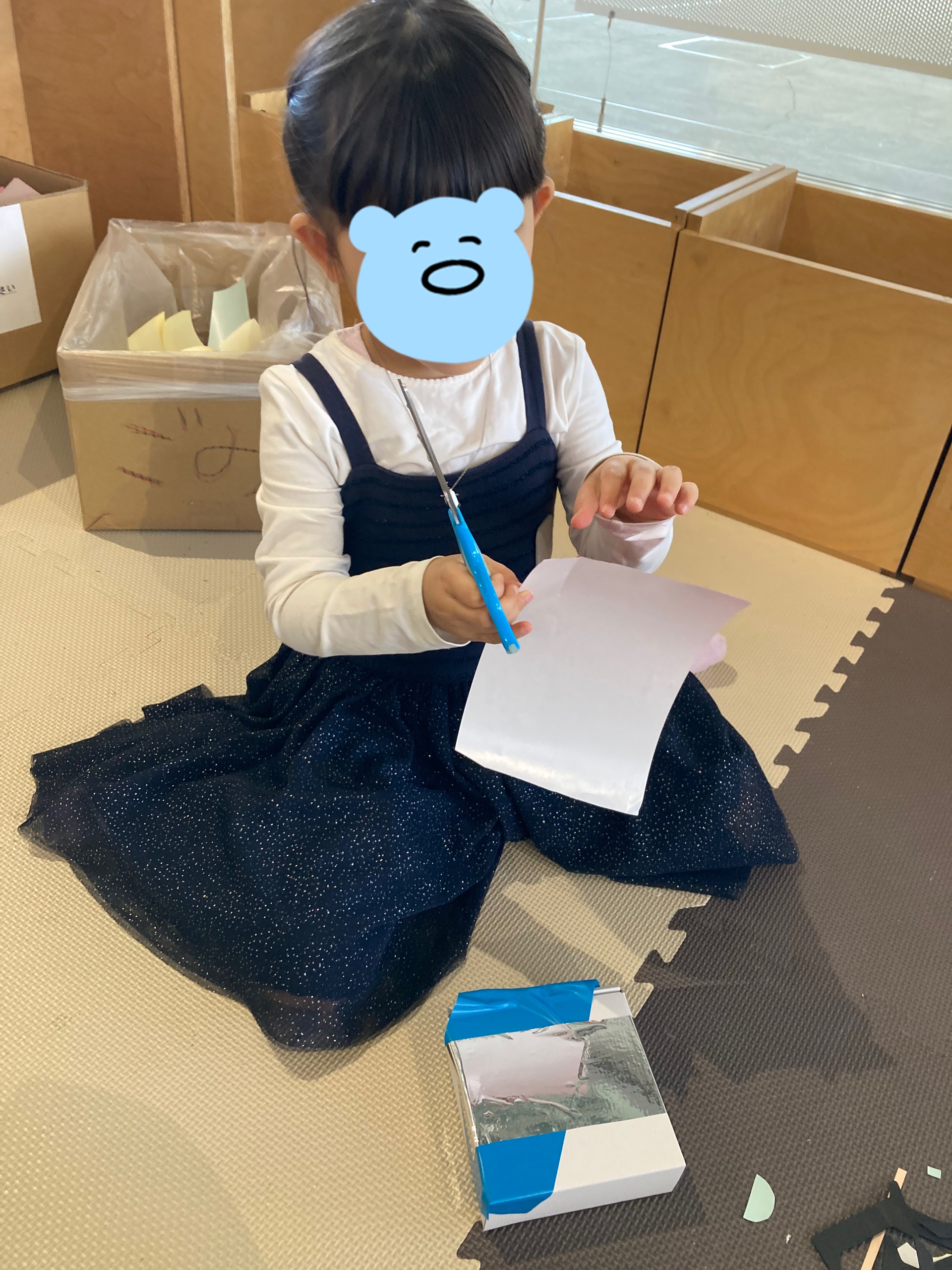 受付でお会計を済ませると、ハサミと糊をカゴに入れて貸してくれて1人1個好きなサイズの箱が貰えます。
