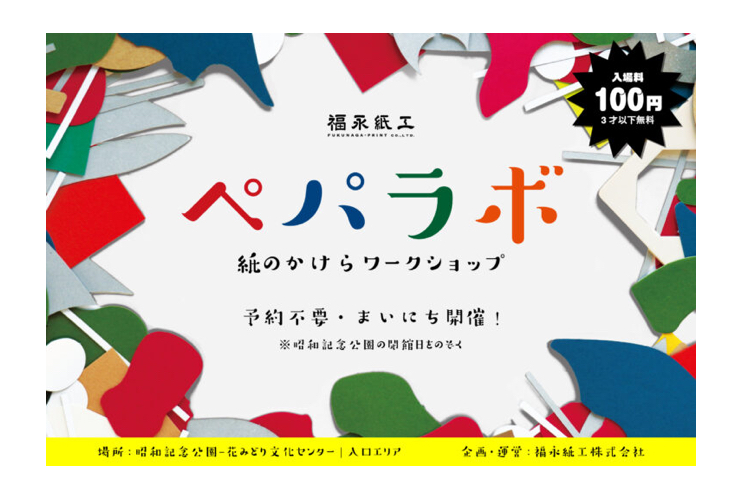 1人100円(3歳以下は無料)で紙のかけらや画材を自由に使える工作スペースです。企画運営は福永紙工株式会社。