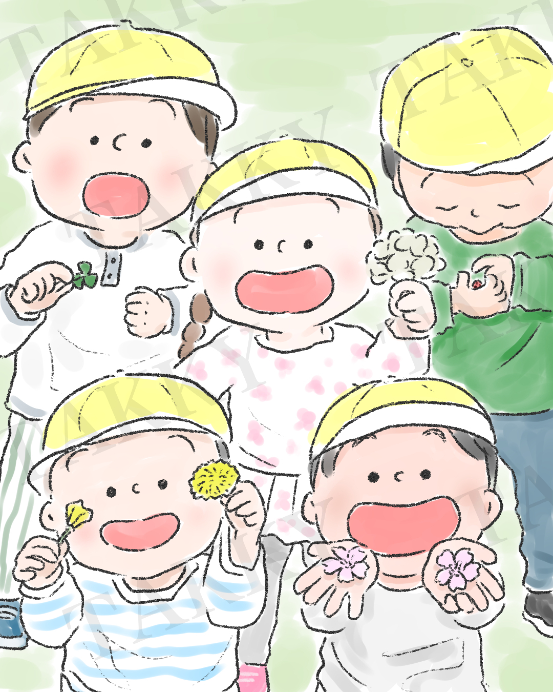 「せんせい!見て!」と保育者の元に集まる子どもたちを描きました✏️何を見つけたのかな?👀✨