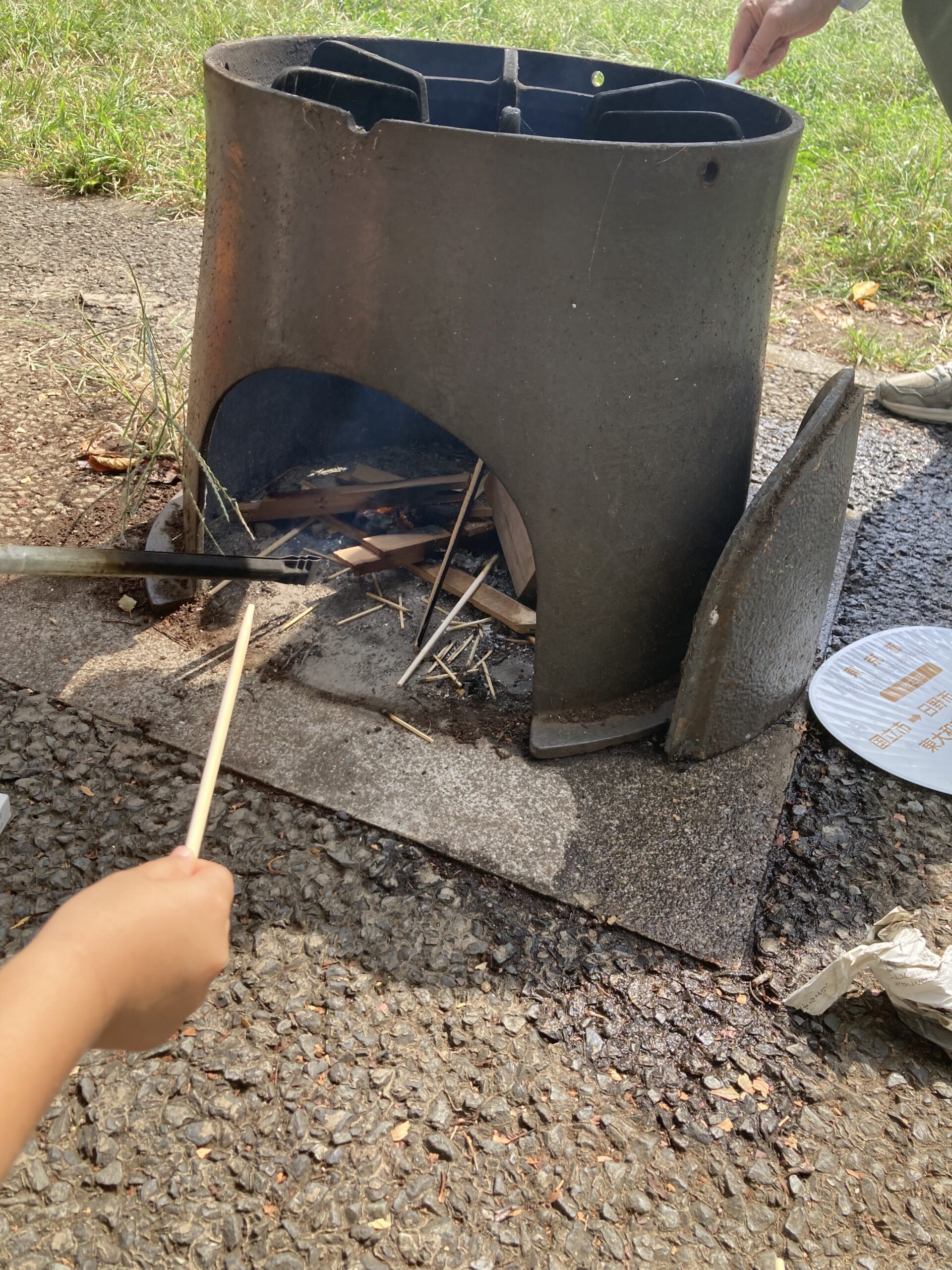 火をつけたいって事でマッチを擦る体験をしました。今、中々マッチを擦る機会なんてないですよね。娘にとって貴重な体験です。私と一緒に擦るも、かまどに入れる前に火は消えてしまいました😂その後、割り箸を入れるのをやってみたいというので割り箸を割り渡すと恐る恐る火の中へ。ドキドキしたね。