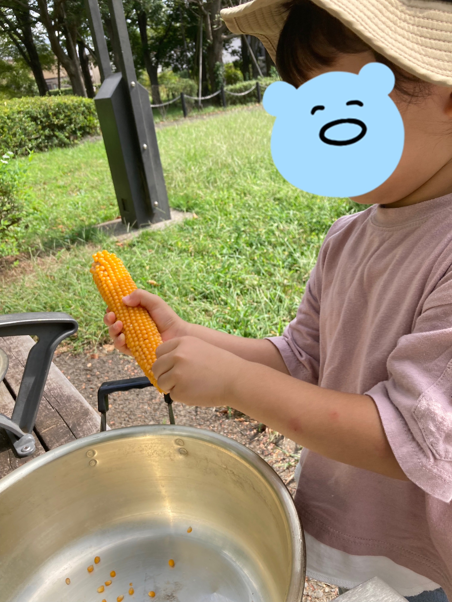 今度はとうもろこしの粒を取る作業。これでポップコーンを作るんだって↓ワクワク